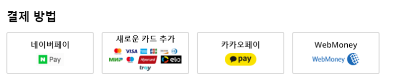 5. 결제 방법을 선택해줍니다. 네이버페이, 신용카드(해외 결제가 가능한 VISA카드나 마스터카드만 가능), 카카오페이 중에서 원하는 결제 방식을 택해줍니다.