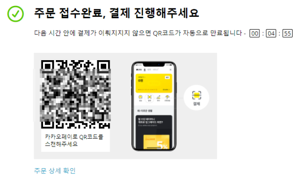 7. 카카오 페이 결제의 경우 아래처럼 QR코드를 스캔해서 인증해주면 이제 주문이 끝난 겁니다.
