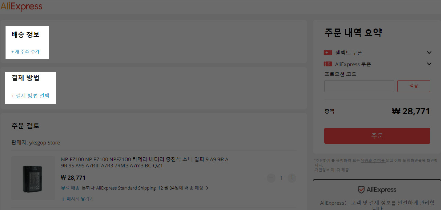 4. 알리익스프레스 구매방법 절차 중에서 가장 중요한 부분이라고 할 수 있습니다. [배송 정보]와 [결제 방법]을 등록해주셔야 합니다.