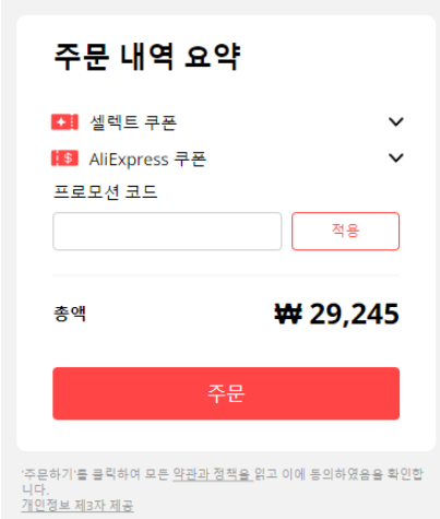 6. 이제 마지막으로 사용 가능한 쿠폰이나, 프로모션 코드가 있다면 적용을 해주시고 할인을 받아서 [주문]을 눌러 마지막 결제창으로 넘어가 줍니다. 새로 가입하신분이라면 약 5천원정도의 신규회원 쿠폰을 받으셨을 것입니다.