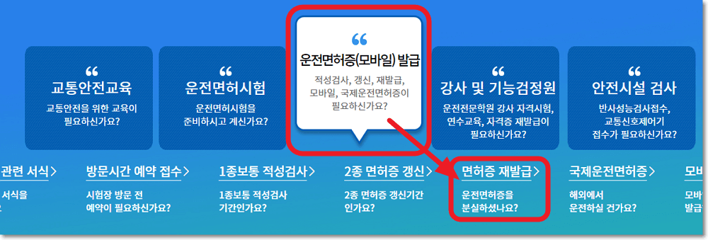 2) 홈페이지 메인 화면의 [운전면허증(모바일)발급]버튼을 누르고, [면허증 재발급]항목으로 들어갑니다.